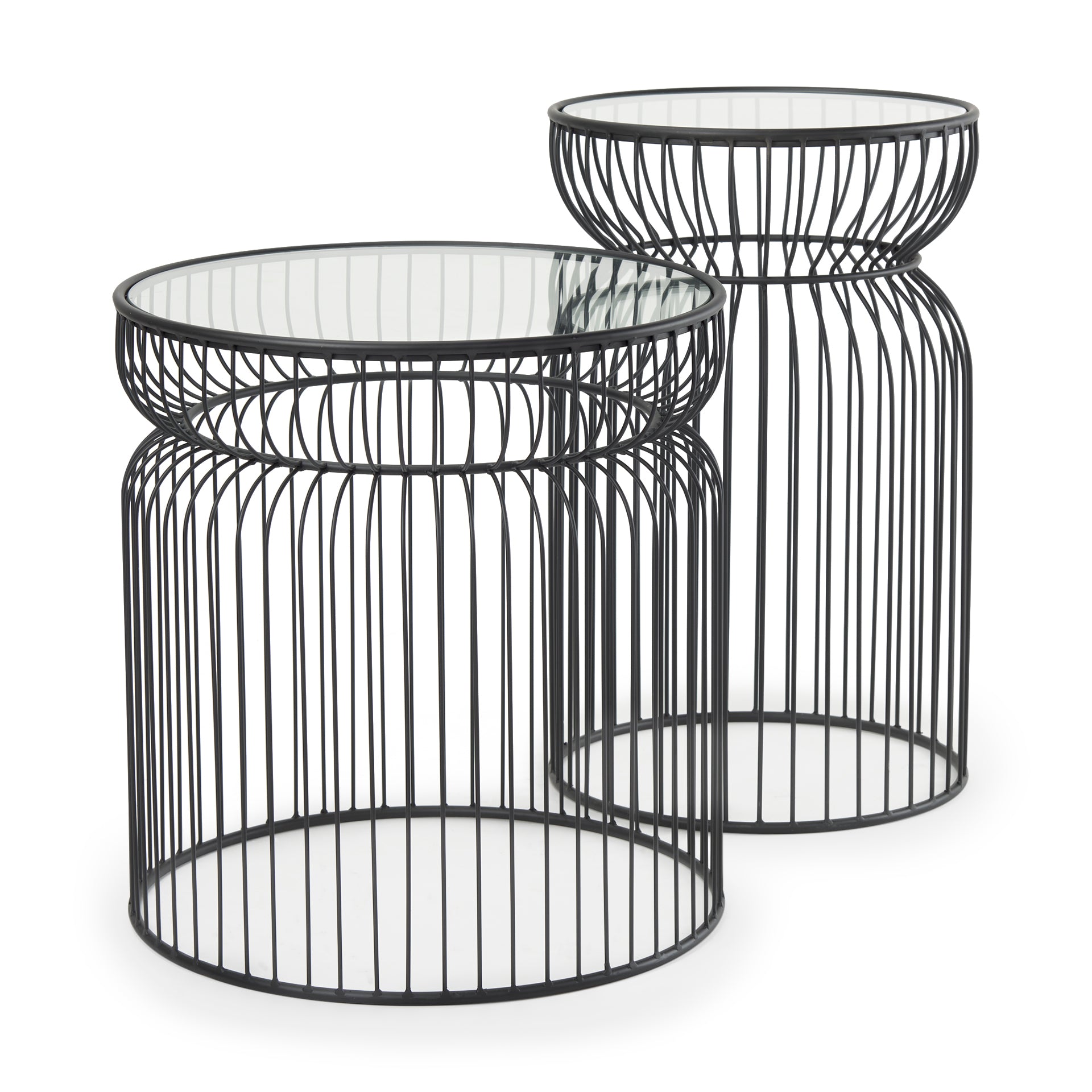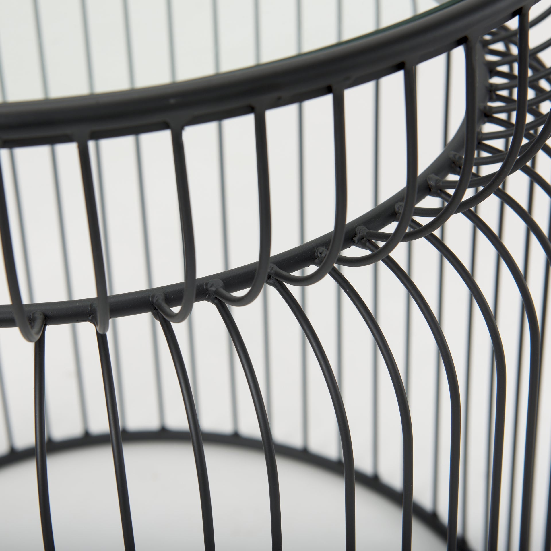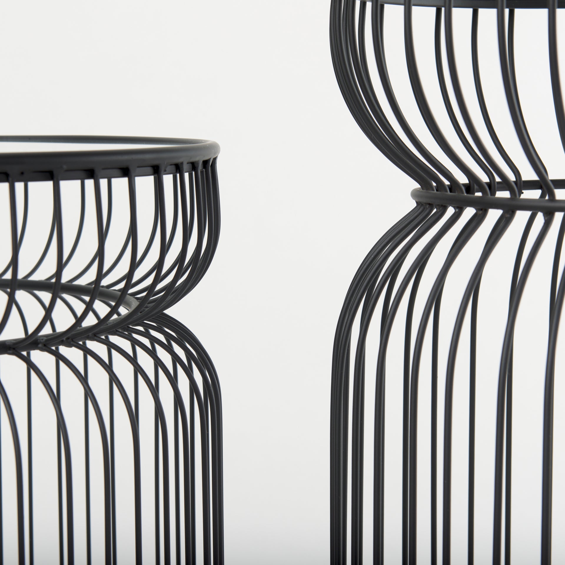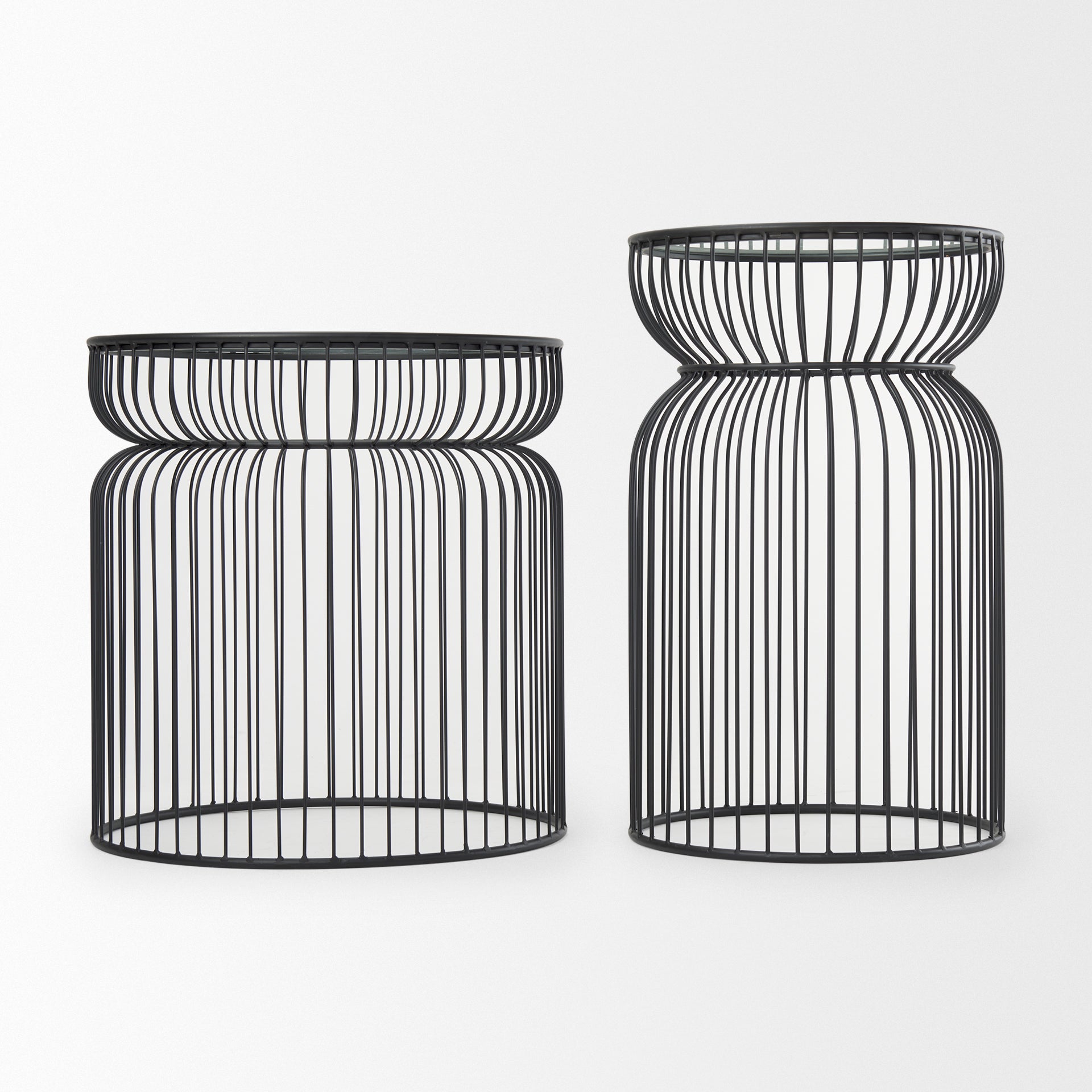 A set of two visually interesting pieces, the Shani Accent Tables each feature a hemmed-in cage-like base finished in a sleek matte black.. One table is tall and cylindrical, whilst the other is shorter with a wider circumference. Each base clasps a tempered glass top that offers a fascinating perspective of the base from above. This table would fit perfectly into Contemporary and Modern design styles.